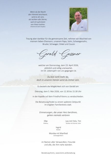 Der FÖRTHOF UHK KREMS gibt das Ableben von Gerald Gassner bekannt.