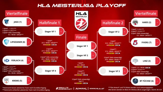 Nach Platz 5 im Grunddurchgang startet Krems ohne Heimrecht in die Best-of-Three-Serie. Spiel 1 findet auswärts in Kärnten statt, ehe der FÖRTHOF UHK KREMS am 5. oder 6. Mai in der Sporthalle Krems antritt. Die genauen Spieltermine werden noch bekanntgegeben.
